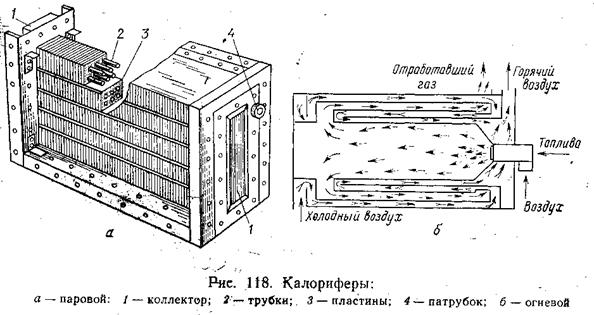 Но во Франции в 1797 г. возник сконструированный Курандо вполне удовлетворительный калорифер, хотя его прообразом и был неудачный калорифер профессора Молитора с его единственной фарфоровой трубой. Курандо проложил в огневом пространстве печи пучок трубок, и не фарфоровых, а медных, и не горизонтально, а наклонно. Получилась конструкция огневоздушного калорифера, которая применяется и сейчас. Такой системой Курандо вполне удачно отопил в 1797 г. фарфоровую фабрику в Париже.
