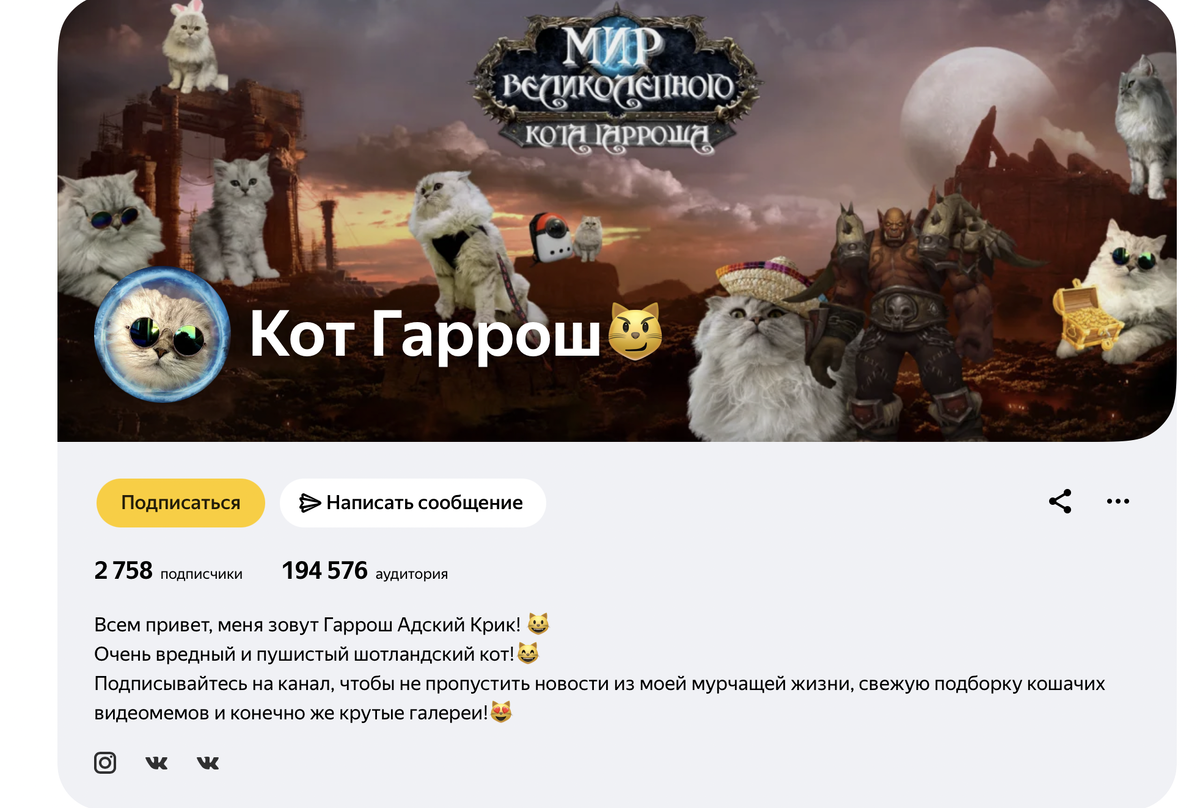 Всем привет! Сегодня пришел конец каналу "Кот Гаррош", мы вели этот канал больше 3-х месяцев и вкладывали много сил в его развитие, у нас была аудитория 200 тысяч человек и 2758 подписчиков. Показатели не малые, но и не большие, нас устраивали темпы развития канала и мы очень любили то, что нашего котика любят в этой социальной сети.