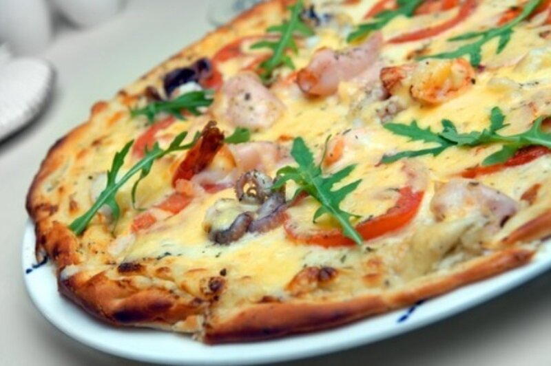 На раскатанное тесто наносим слой томатной пасты, а сверху раскладываем креветки и кольца кальмаров.