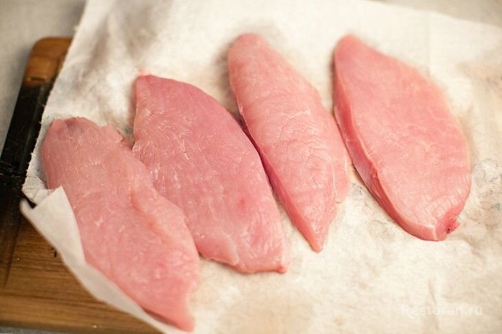 Шаг 1 Филе индейки моем, обсушиваем бумажными полотенцами и режем на ломти толщиной в сантиметр (как на стейк).
