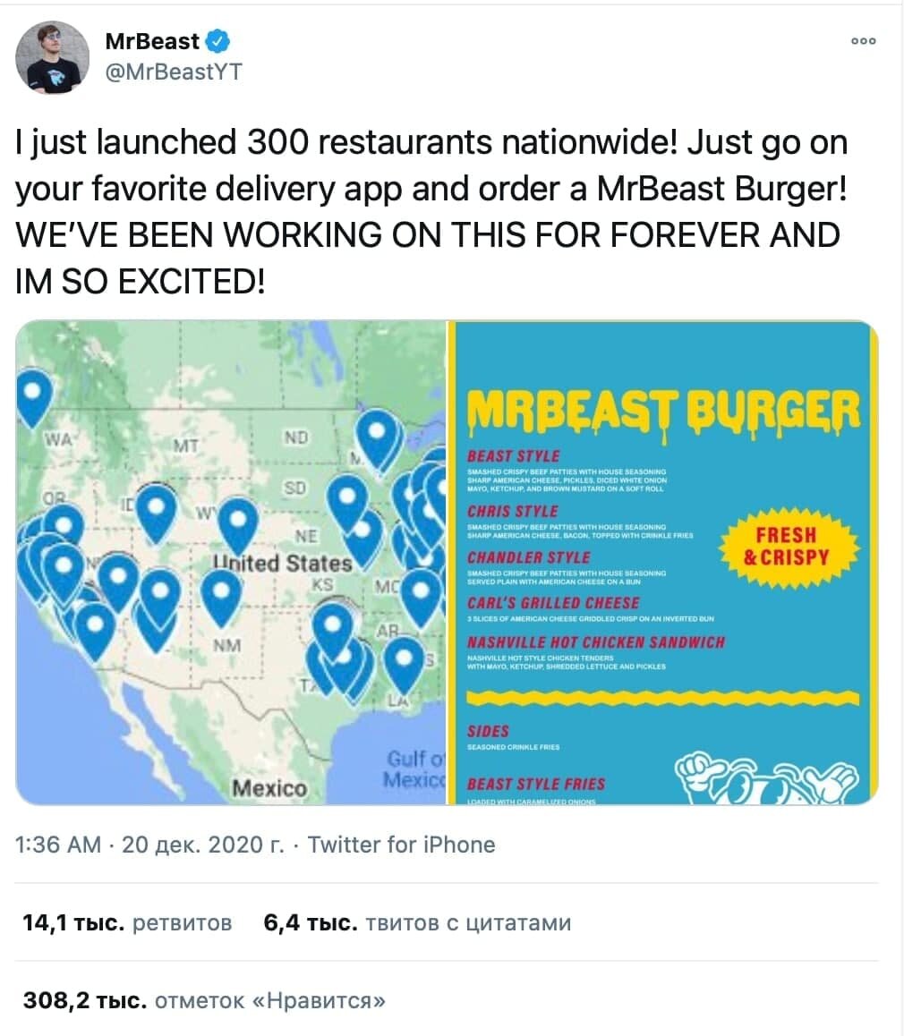 Невероятно крутая история (https://vc.ru/food/189439-set-temnyh-kuhon-zapustila-za-den-300-restoranov-v-ssha-dlya-blogera-servis-vzletel-na-pervoe-mesto-v-app-store): MrBeast, чувак с 48-миллионной аудиторией на YouTube, запустил своё приложение доставки еды — MrBeast Burger. Внутри больше 300 ресторанов по всему США: все они в формате dark kitchen — это когда ресторан работает только на доставку. Типичными блогерскими трюками он привлёк кучу вниманию к запуску: раздавал бургеры, наличку, iPad и другие призы. Всё это завирусилось так, что полиции пришлось вмешаться и ограничить очередь — настолько много было людей. Через сутки приложение возглавило App Store, подвинули даже YouTube.