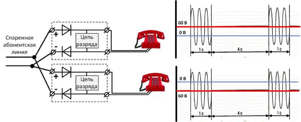 Как можно посчитать или увидеть из рисунка, посылка вызова подается не только вызываемому абоненту. Верхушки синусоиды попадают через диод и спаренному с ним – телефон в этом случае может подзванивать, чтобы этого не было нужно отрегулировать звонок.