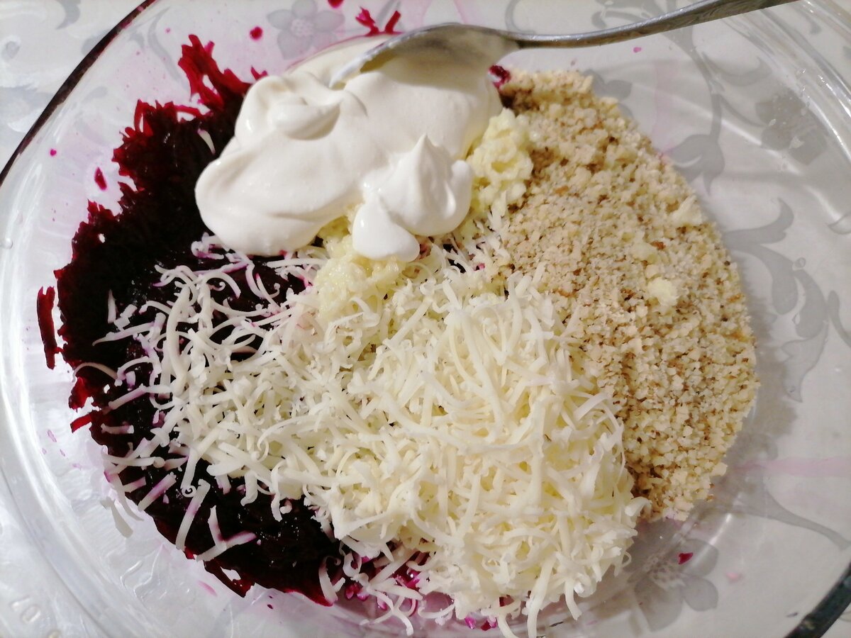 В глубокую тарелку натереть варенную свеклу. Дать свекле немного постоять. Выделится жидкость, которую нужно будет слить.