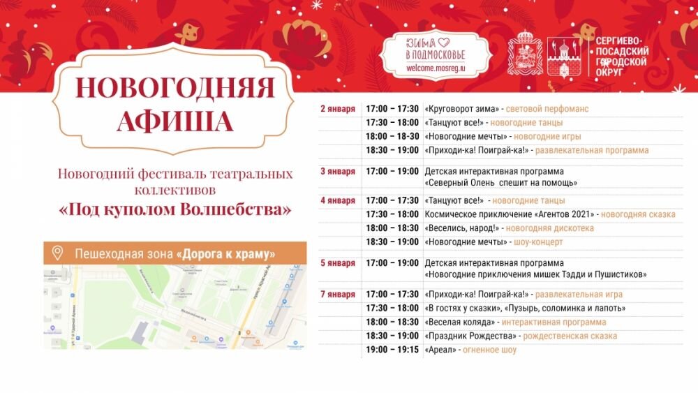 • На две бесплатные пешеходные экскурсии приглашают сергиевопосадцев и гостей города в эти дни: первая начнётся 4 января в 12 часов и расскажет об исторических и архитектурных памятниках ХIХ-ХХ веков, познакомит с традиционными посадскими промыслами. Отправление от библиотеки им. В. Розанова на Валовой улице. Вторая намечена на полдень 8 января и называется «Рождественское путешествие в Сергиевский Посад», место сбора — памятник родителям преподобного Сергия напротив Лавры. Обе экскурсии подготовили краеведы библиотеки им. В. Розанова.