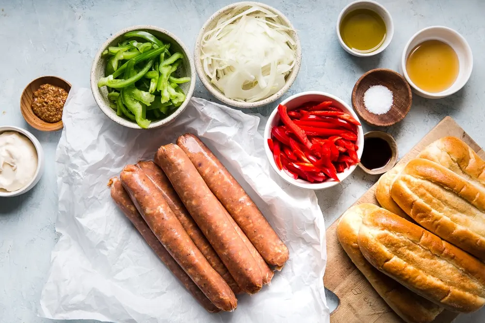 - Подавайте колбасу и овощи в булочках смазанными соусом.