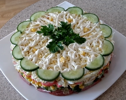 7. Выкладывать блюдо слоями, промазывая майонезом.