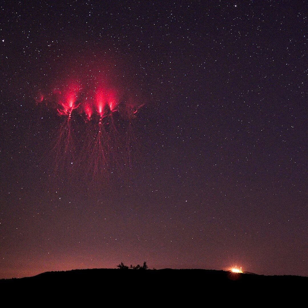 Некоторые спрайты, подобные тому, что сфотографировал Хаммел, имеют форму медуз. Другие представляют собой вертикальные столбы красного света с извивающимися вниз усиками: их называют морковными спрайтами.