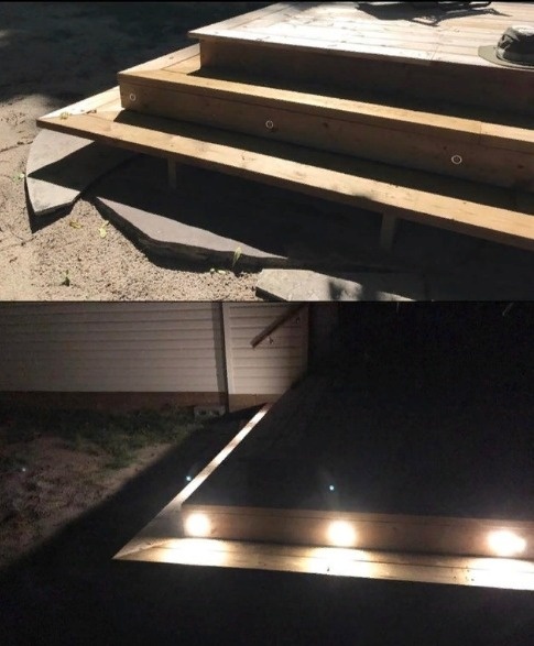 Кто-то решил подшутить над остальными (а может и самим собой) и подсветить только среднюю ступеньку. По дню-то к решению претензий нет, даже смотрится симпатично. Но вот ночью есть риск разбить нос, не раскрыв хитрый замысел хозяина.