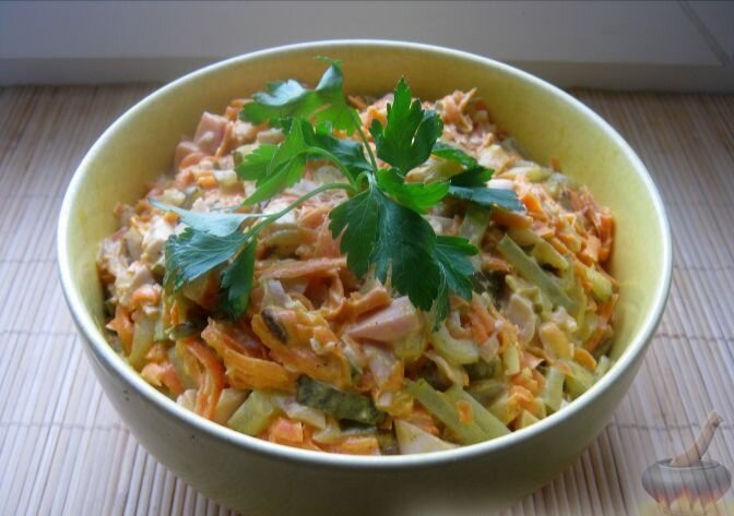 Все ингредиенты выложить в миску. Посолить и поперчить по вкусу. Заправить майонезом.