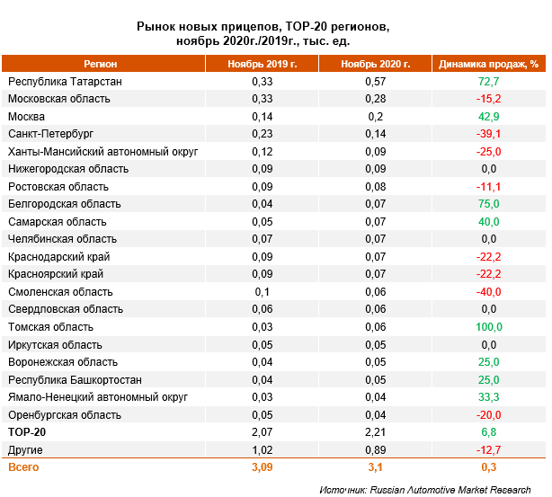 Рейтинг региональных рынков в ноябре 2020 г. возглавила Республика Татарстан, где продажи новой прицепной техники выросли на 72,7%. В ТОР-3 региональных рынков также вошли Московская область и Москва.