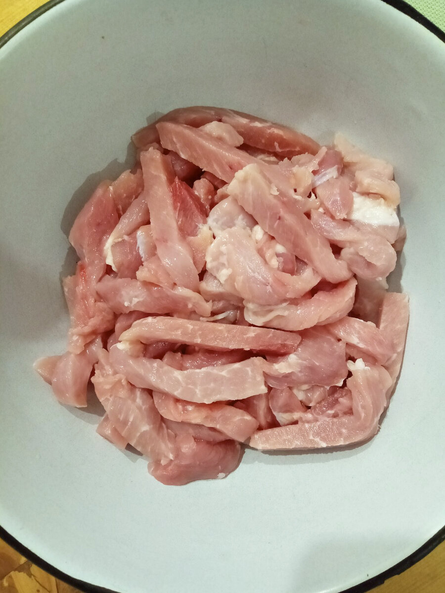 Для начала нам нужно замариновать мясо. Я делаю это с вечера. Мясо нарезаем брусочками, толщиной, примерно 1 см. В чашу кладём мясо, выливаем кефир и добавляем специи по вкусу (у меня соль и смесь перцев). Тщательно перемешиваем, накрываем пищевой плёнкой и убираем на ночь в холодильник.