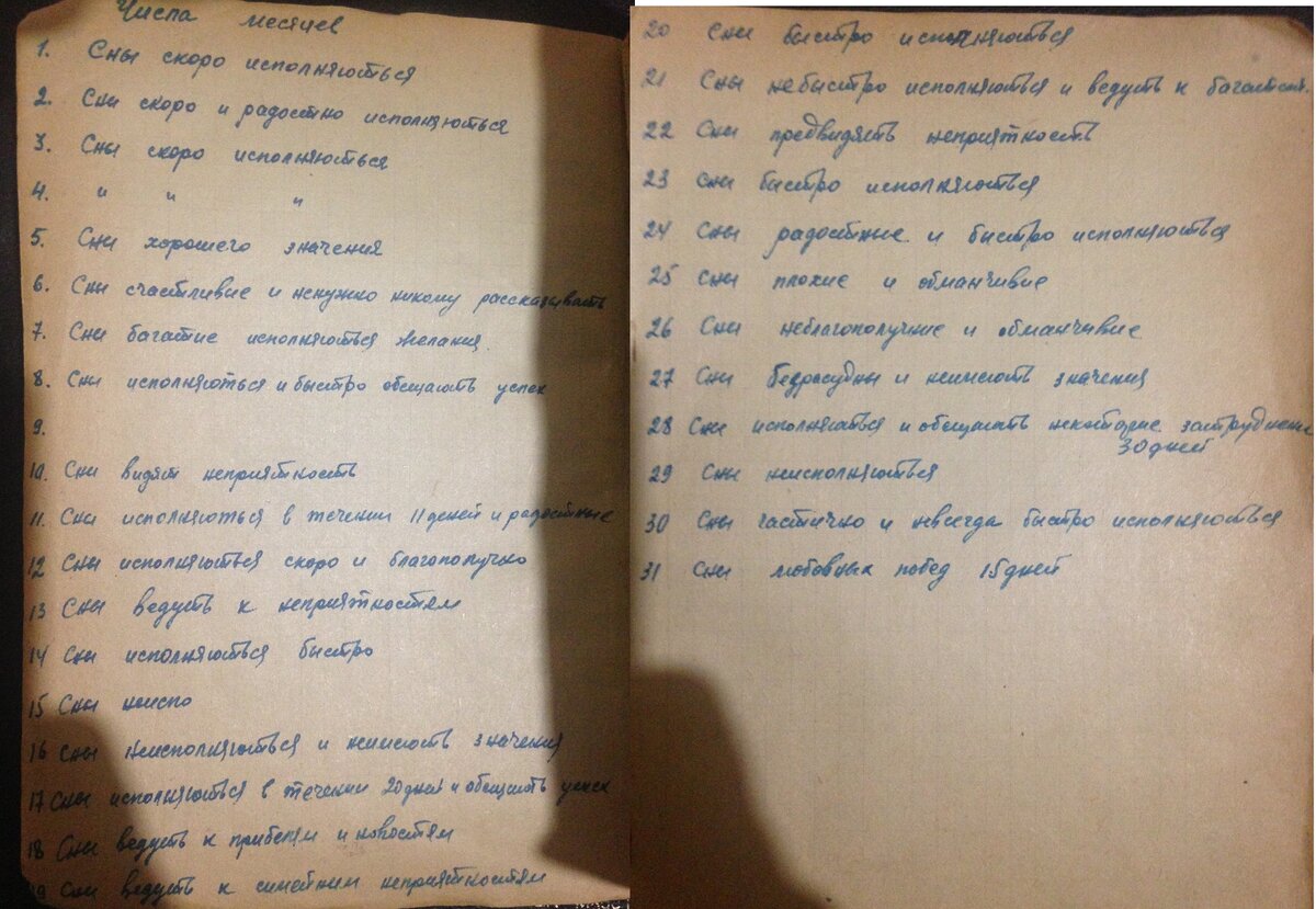 Мне на руки попался сонник, написанный вручную. Аналогов не нашел, хотел бы привести его здесь. Состоит из ежедневного значения снов в рамках месяца, трактовки каждого видения. Датирован 06.12.1961 г., составлен в городе Киеве, Украина. Размещать материал буду постепенно.