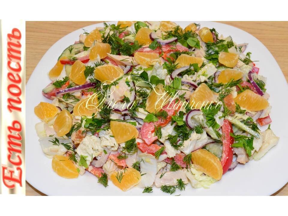 Выложить на блюдо, посыпать резаной зеленью, сверху разложить дольки мандарина, порезанные пополам.