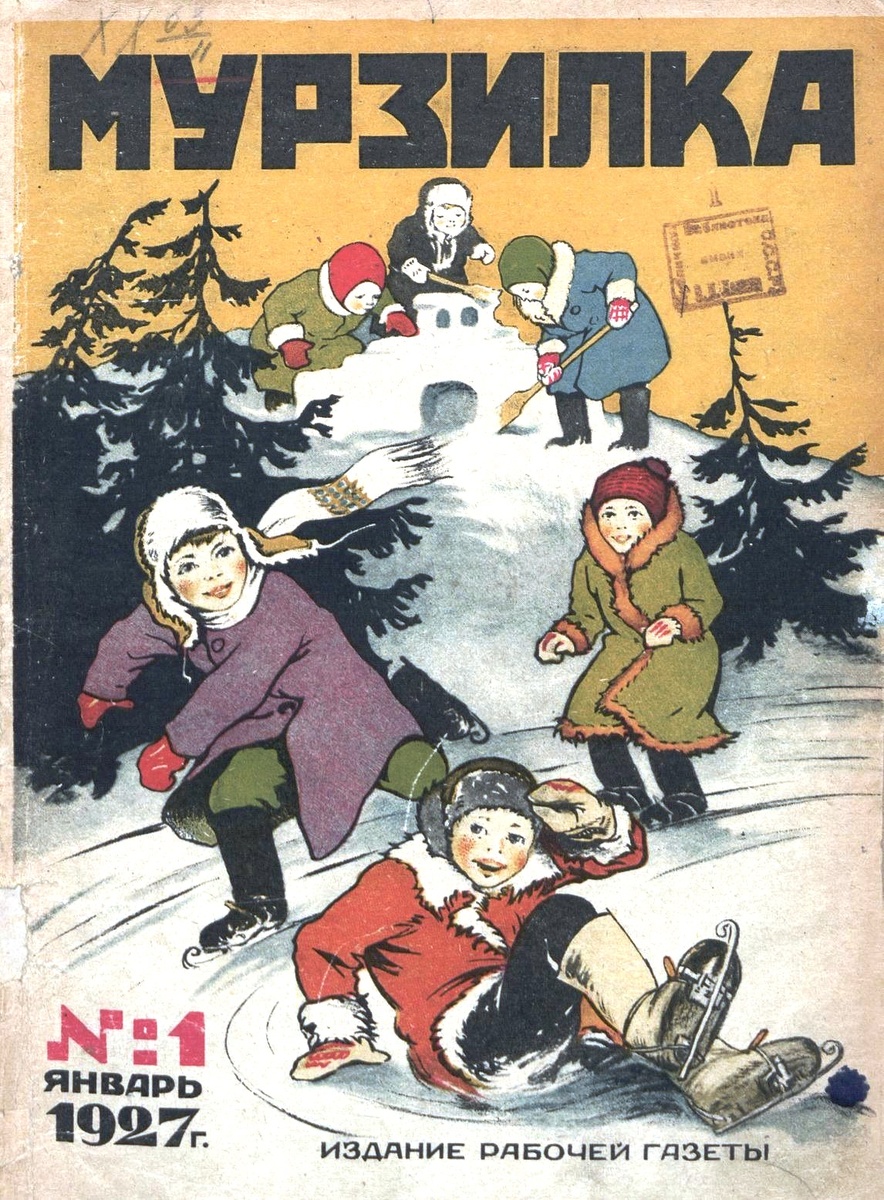 Как вы думаете, что строят дети из снега на этой зимней обложке январского номера журнала "Мурзилка" за 1927 год?