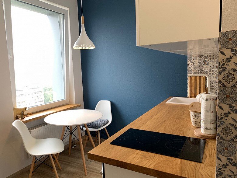 Хозяйке пришлось разделить рабочую зону на две части. В основной нашлось место для мойки, посудомойки, бутылочницы, а также варочной панели на две конфорки с комбинированным духовым шкафом (СВЧ+духовка). От вытяжки решено было отказаться.