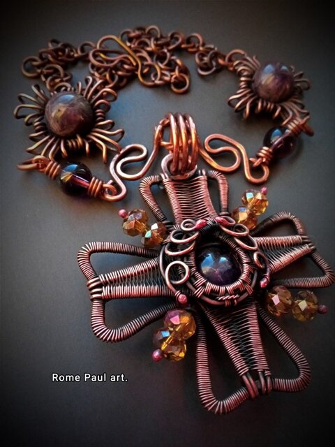 МАТЕРИАЛЫ: облагороженная (патинированная) кованая медь, натуральные аметисты вида Брэндберг и Шеврон, хрустальные рондели