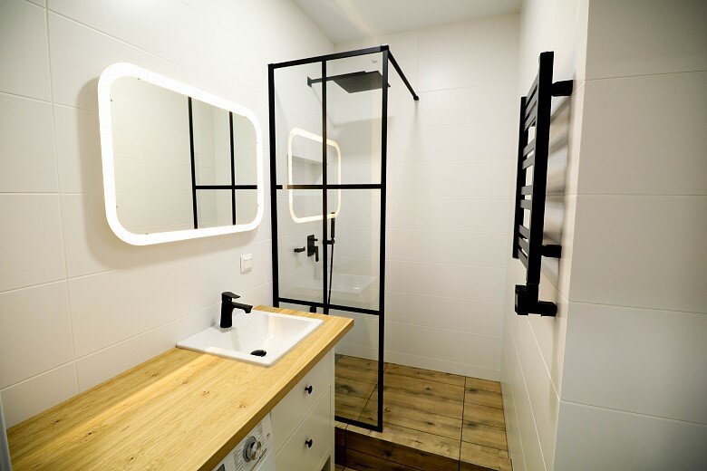 Из-за вытянутой формы (1,4х2,2 м) других вариантов, кроме душевой кабинки в строительном исполнении, не было. Ее подиум приподнят относительно пола для проведения коммуникаций водоотведения. По всей ширине душевой установлен душевой лоток (19 000 р.). Стеклянная перегородка обошлась всего в 14 000 р.