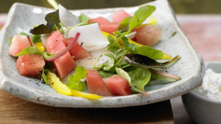 Оригинальный летний салат понравится любителям контрастных блюд. Сочетание сладкого арбуза, с редькой и творогом делает блюдо невероятно вкусным!