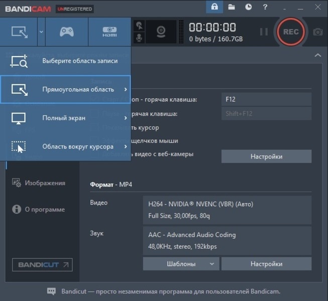 Bandicam — одна из самых известных программ, которая получила популярность благодаря интуитивно-понятному интерфейсу и достаточно продвинутому функционалу. Первое, что можно отметить — это впечатляющий выбор области записи. Вы можете указать весь экран, самостоятельно отчертить область или выбрать прямоугольник из популярных разрешений вплоть до 4К. Предусмотрительно есть и режим записи зоны вокруг курсора, и даже игровой режим со считыванием потока от DirectX.