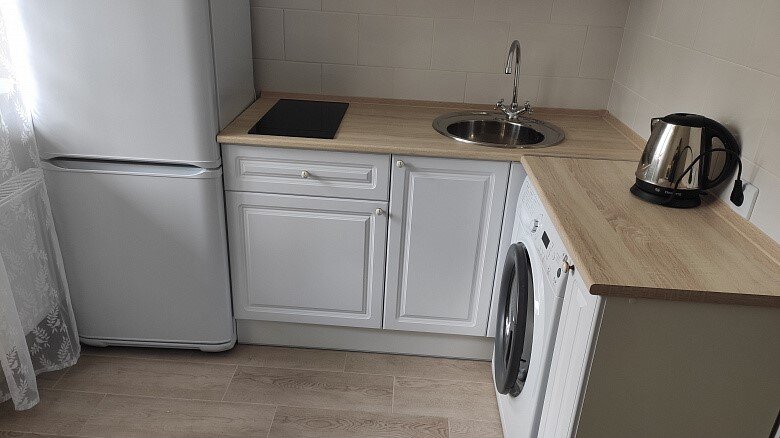 Благодаря лучевой разводке отопления в квартире нет стояков, зато есть бесплатные теплые полы в отопительный сезон. На полу в прихожей и кухне уложили керамогранит, в комнате – ламинат.