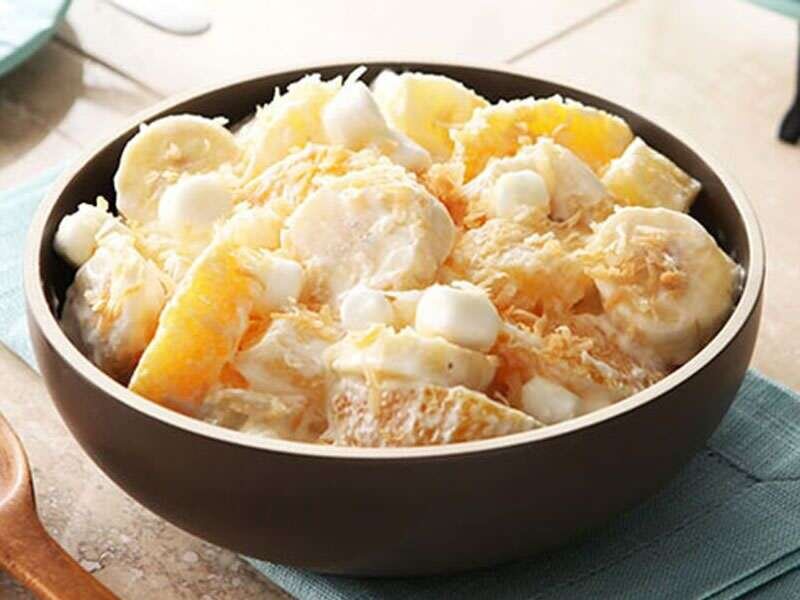 Перемешать нарезанные сыр, бананы и кусочки консервированных ананасов. Заправить майонезом.
