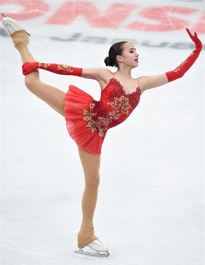 Алина Загитова делает fan-спираль во время показательного выступления.