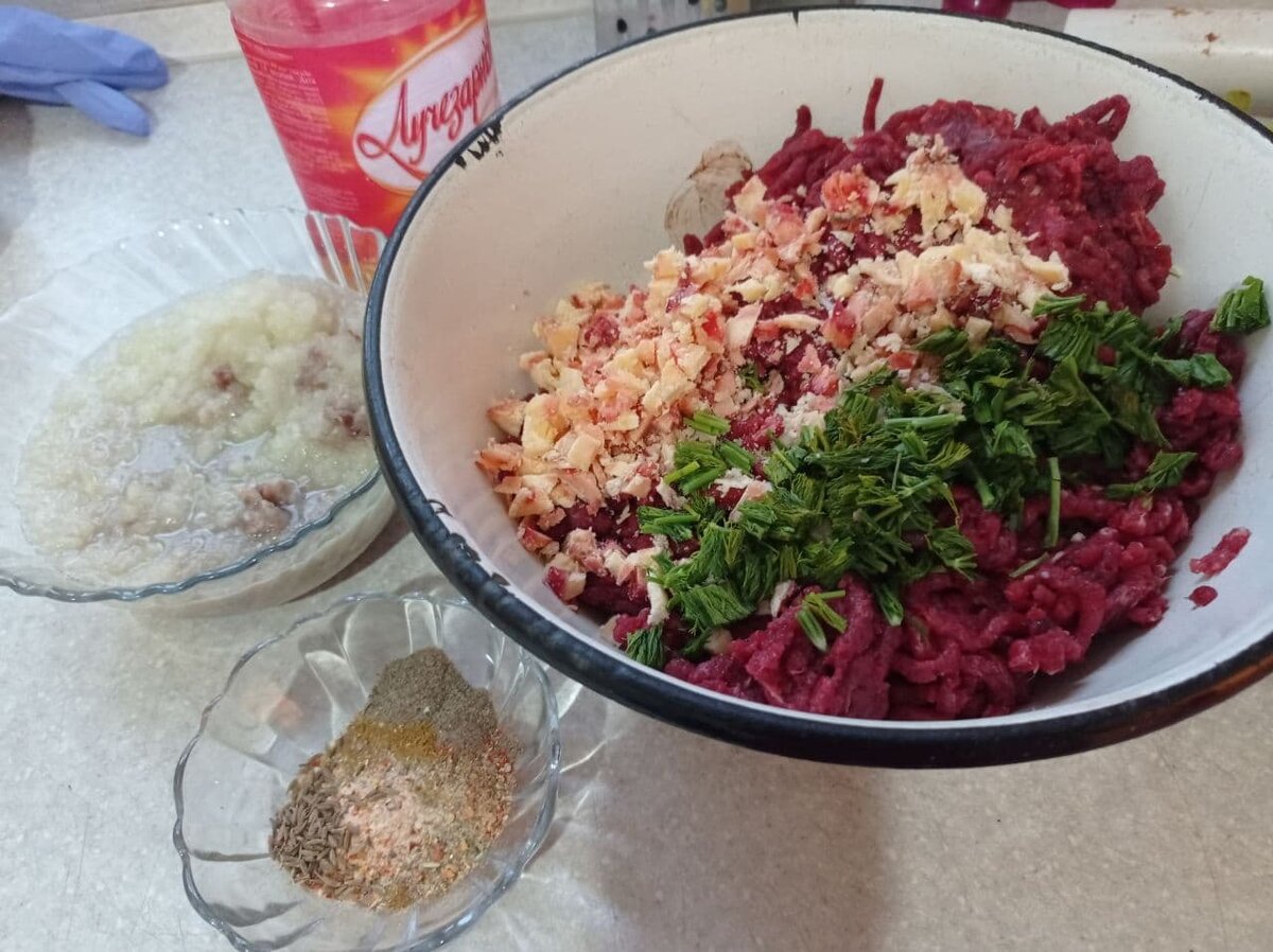 ШАГ 1. Самое главное, как вы понимаете в этом блюде конечно же фарш из которого будет в дальнейшем сформирован наш люля. Лично я покупаю говядину и пропускаю её через мясорубку. Таким образом у меня нет сомнений в происхождение фарша и его качестве. В фарш надо добавить сало или жир, а так же зелень