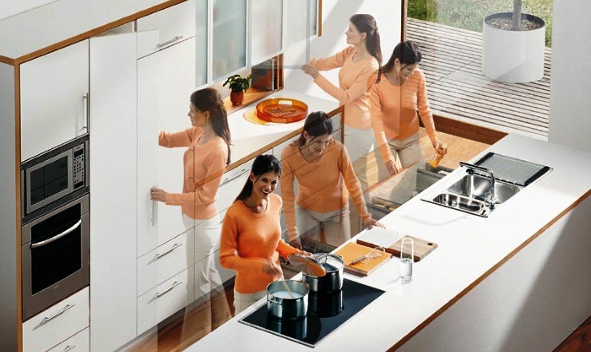 Работу на кухне можно без преувеличения сравнить с активными занятиями спортом: здесь Вам и многочасовая ходьба, и приседания, и наклоны, и энергичные движения рук. И дабы после приготовления семейного ужина мы не испытывали избыточного утомления, профильные специалисты – социологи, архитекторы и дизайнеры, начали заниматься исследованиями и проработкой практических решений по оптимизации жизненного пространства ещё в XIX веке. Кстати, вполне закономерно, что пионерами на пути преобразования кухни из подсобного помещения в самую высокотехнологичную комнату дома стали именно женщины.