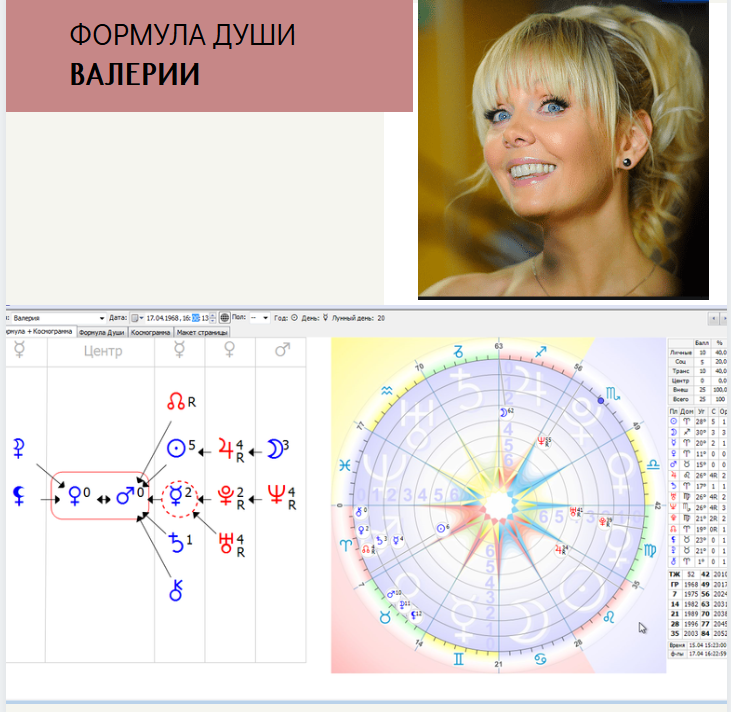 Знакомясь с биографией Валерии, сразу отметила для себя, что Валерия была трижды замужем. Следовательно, Марс где-то на ведущих позициях должен стоять. И действительно, построив Формулу Души видим, что Марс стоит в центре. Женщина с Марсом активная, напористая, правдивая, есть желание быть первой, но и колкая, строптивая, есть нежелание соглашаться с чужим мнением. Как правило, женщина с Марсом привлекательна для мужчин, но вот построить отношения с сильным мужчиной не всегда просто, так как сама сильная, подсознательно соревнуется с мужчинами, не доверяет, считает их слабыми.