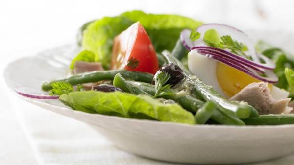Разложите лук, помидоры, яйца и бобы на салат. Добавьте ломтики тунца и маленькие оливки. Вымешайте с оставшимся соусом. Вымойте петрушку, отряхните от воды, оборвите листья и украсьте салат.