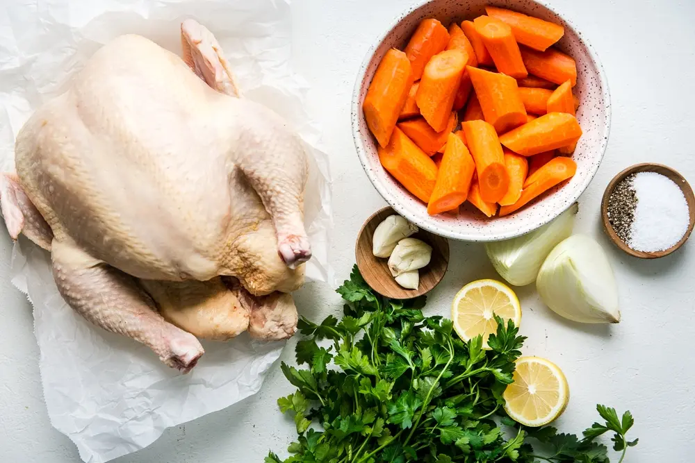 - Когда внутренняя температура самой толстой части курицы достигает 160 и сок выливается, курица готова! Бросьте морковь в куриный сок и посыпьте свежей петрушкой.