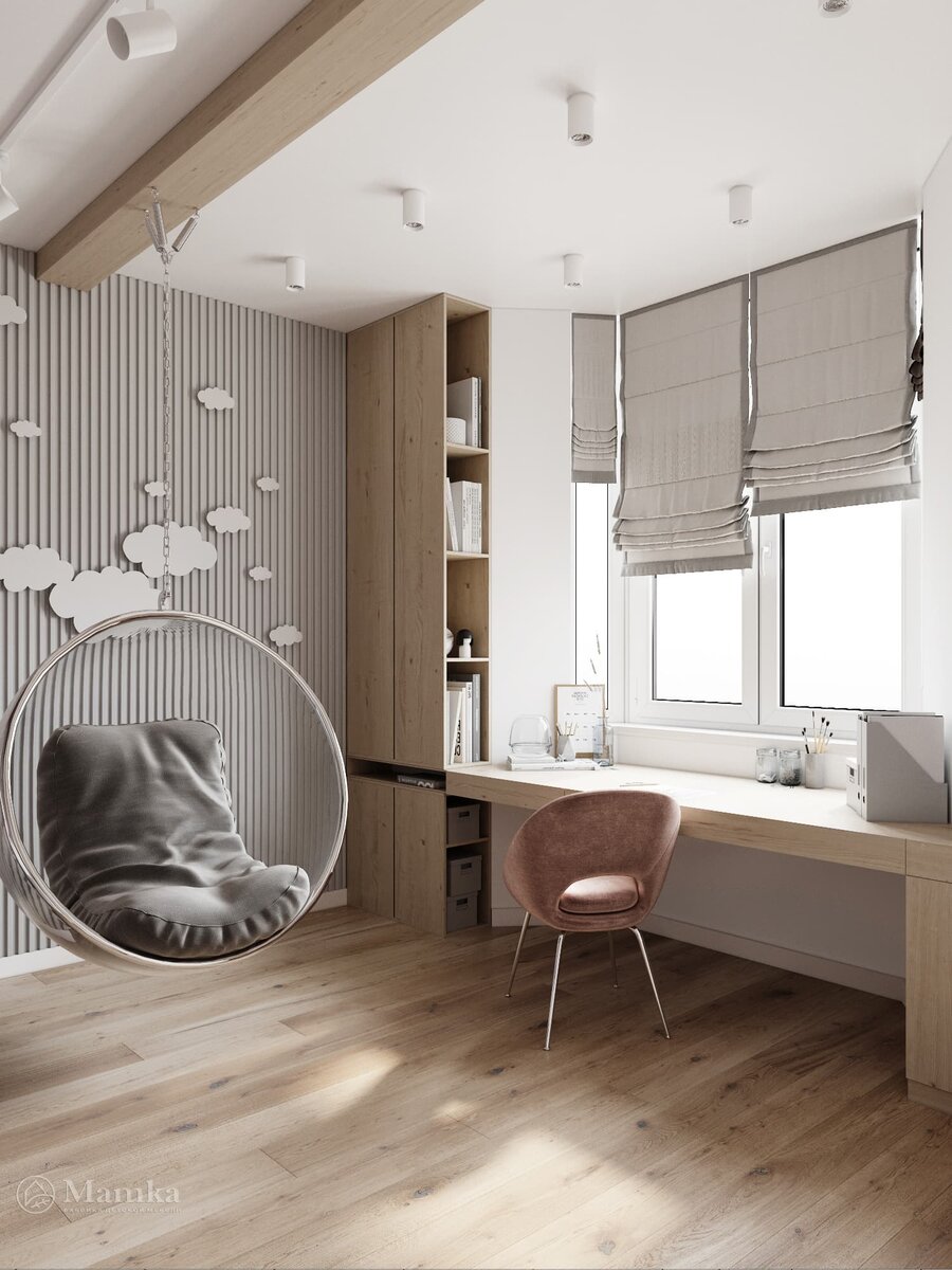 Для просторной комнаты девочки старшего возраста дизайнер выбрал популярный скандинавский стиль. Интерьер получился лаконичным, функциональным и уютным. Для отделки были выбраны нежные пастельные тона. Стена между кроватью и рабочим местом оформлена декоративной панелью из вертикальных реек из дерева. Поверхность украшена симпатичными тучками разных размеров и форм.