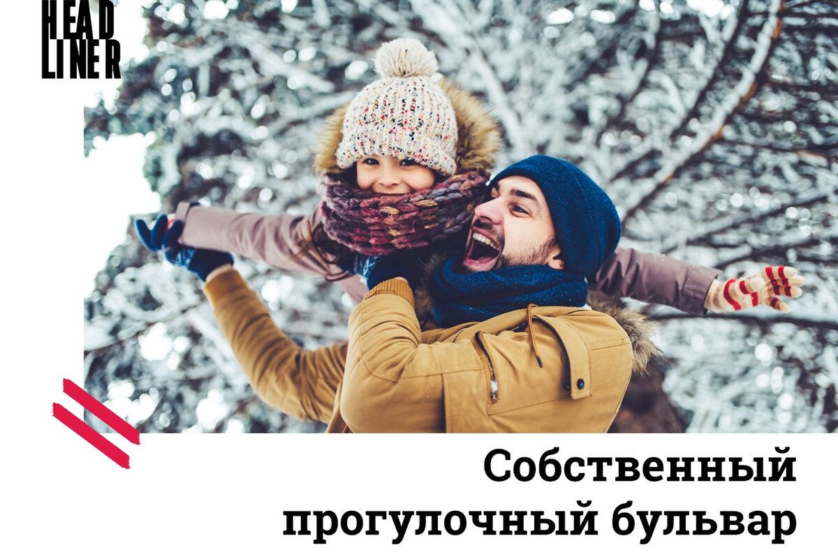 В парках, расположенных поблизости от квартала Headliner, есть все необходимое для зимнего отдыха: чистые прогулочные дорожки, теплые скамейки, кофейни.