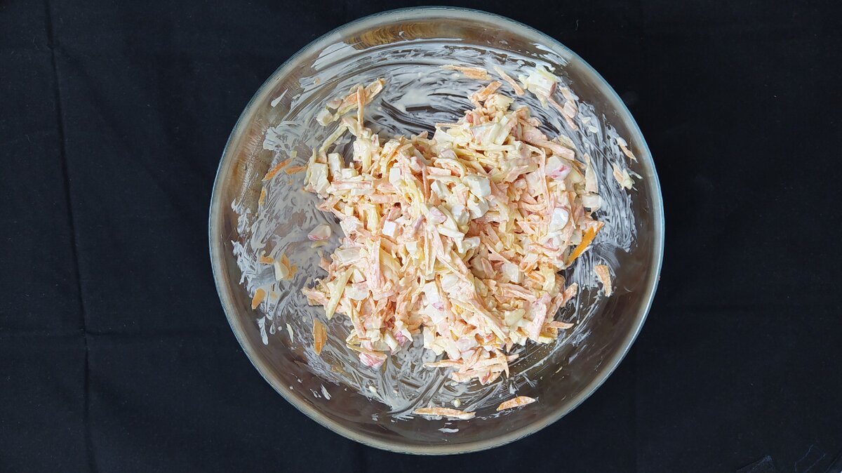 Теперь самое главное. Время заправлять салат соусом. Будем использовать домашний майонез.
