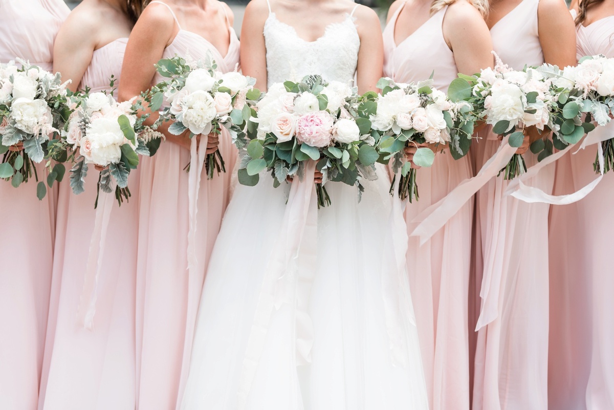 Цветы подружек невесты – это такая же часть интерьера, как и колонны, столы и гирлянды. Поэтому они должны вписываться в обстановку, не выделяться и не перекрывать своей яркостью букет невесты.
