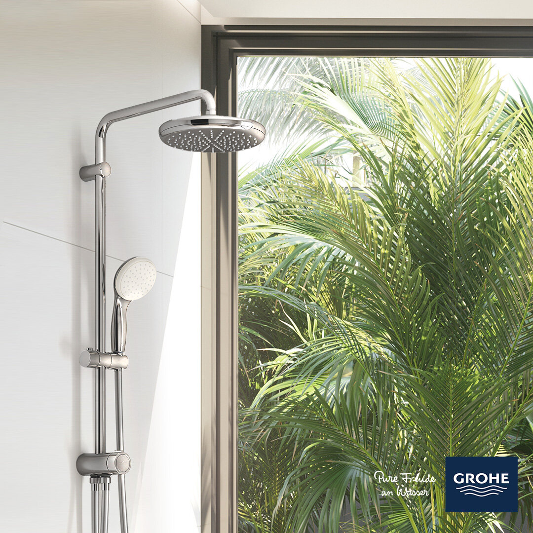 Четкий цилиндрический профиль и характерные скошенные детали помогают душевой системе вписаться в интерьер современных ванных комнат. Она проста в установке, а технологии GROHE выводят принятие душа на новый уровень.