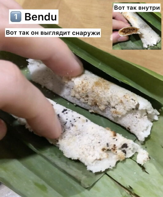 🥠Самая интересная текстура у десерта bendu. Это копчёная кокосовая стружка с сахаром, завернутая в сухой термически необработанный блинчик. А он, в свою очередь, завёрнут в банановый лист.