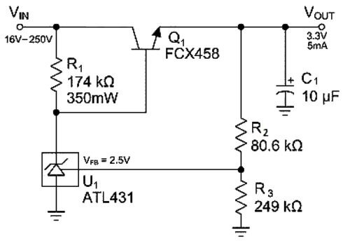 По сути, схема представляет собой обычный линейный понижающий стабилизатор напряжения на одном транзисторе, где в качестве источника опорного напряжения используется регулируемый стабилитрон типа АТЛ431. Это позволяет получить достаточно стабильное напряжение на выходе стабилизатора.