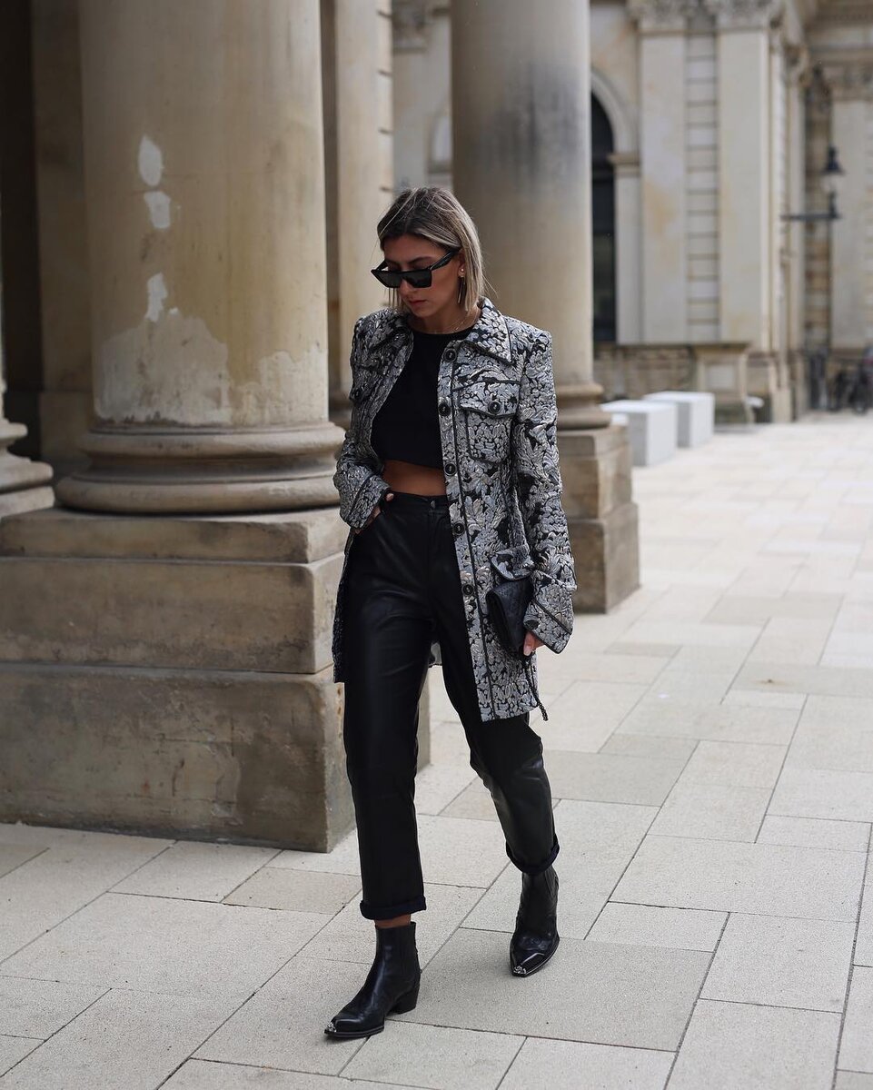 Челси и джинсы – хорошее сочетание. Джинсы должны быть укороченными или их необходимо подвернуть, чтобы ботинки были полностью видны. Сверху нужно надеть футболку, топ, джемпер или свитшот а в холодное время года можно накинуть бомбер. Можно такой образ сочетать и с пальто классического кроя или оверсайз.