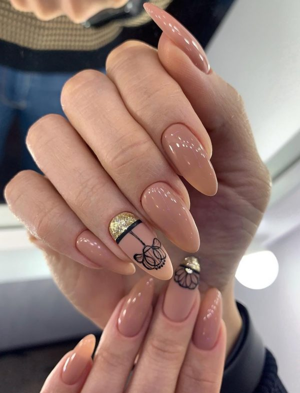 Хоть рисунки и являются самым популярным выбором, но просто картинка не будет смотреться. Самое главное - это правильно подобранный фон. И именно бежевый является универсальным цветом, который подойдёт под любой рисунок. С таким дизайном ногти будут смотреть неимоверно притягивающими и завораживающими. Лучше всего сочетать контрасты цветов. Бежевый и белый, можно чёрный. Достаточно хорошо смотрятся рисунки, выполненные серебряным лаком.