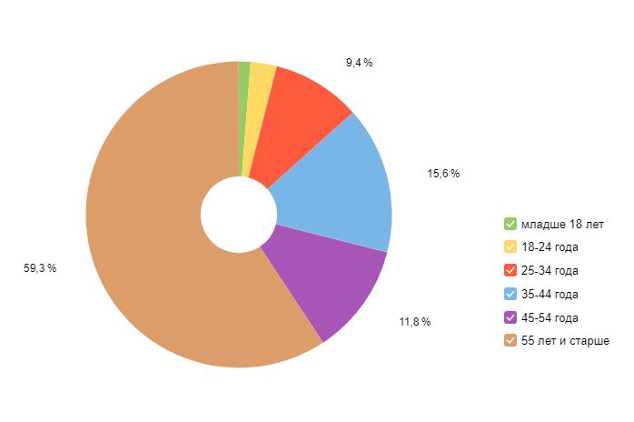 Сам канал первую очередь посвящен сплетням и новостям из мира шоу-биза. Я стараюсь собирать наиболее актуальную и интересную информацию для своей аудитории, а она в основном состоит, если верить статистике, из людей возрастного диапазона от 35 лет, причем колоссальные 59.3 % занимают люди от 55 лет. Конкретные цифры приведены в статистике ниже:
