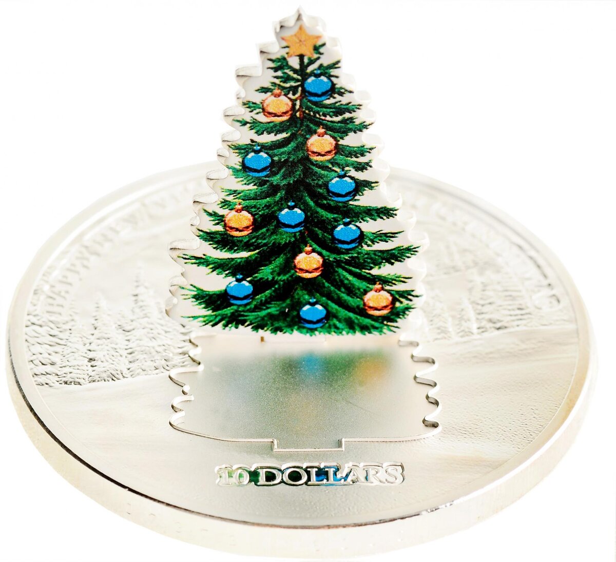 10 долларов 2008 Науру выполнена из серебра 999 пробы. Особенностью данной монеты является центральная пластиковая вставка с изображением новогодней елки, которую можно развернуть, вставив в специальный паз посередине.