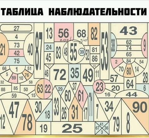 Найдите на этой таблице последовательно цифры от 1 до 90 включительно. ⠀ За 5-10 мин, то у вас исключительная наблюдательность. За 10-15 мин — хорошая. За 15-20 мин — средняя. За 20-25 мин — удовлетворительная.