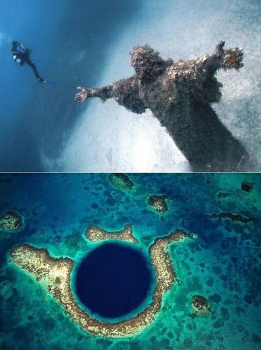 Это - статуя «Христос из Бездны», установленная на дне залива Сан Фруттуозо в Италии. В мире есть ещё три таких: ещё одна в Италии, на дне озeра Палю; одна во Флориде и одна на Гренаде. Они были установлены дайверами для дайверов, ведь одно дело - просто спуститься под воду, а другое - встретить там огромного бронзового Иисуса Христа.