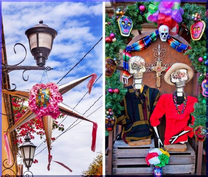 Елки украшают человеческими черепами — это такие игрушечные черепа, которые называются калавер. А еще надо с закрытыми глазами разбить пиньяту. Это звезда из глины. В нее кладут сласти, и она является символом земных грехов. Разбивая ее прогоняешь грех и беду из своей жизни.