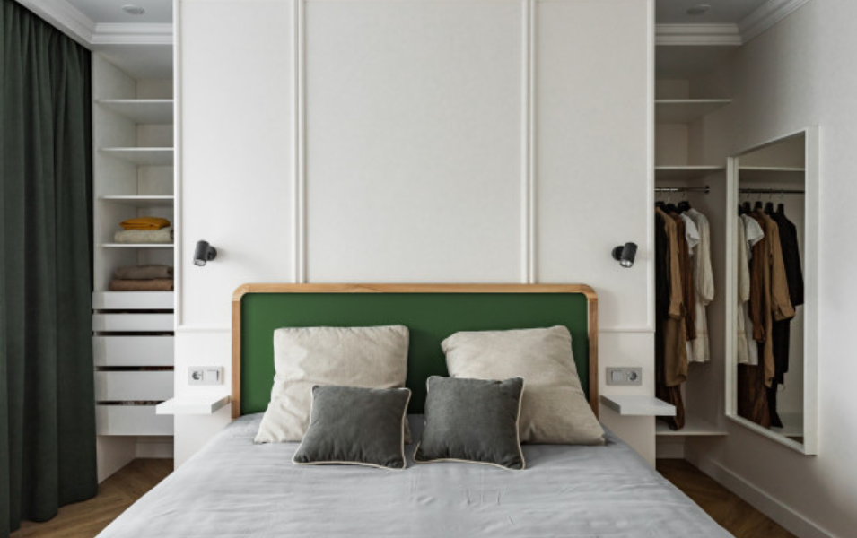 Эта идея оформления стен спальни позволяет максимально скрыть гардеробную.