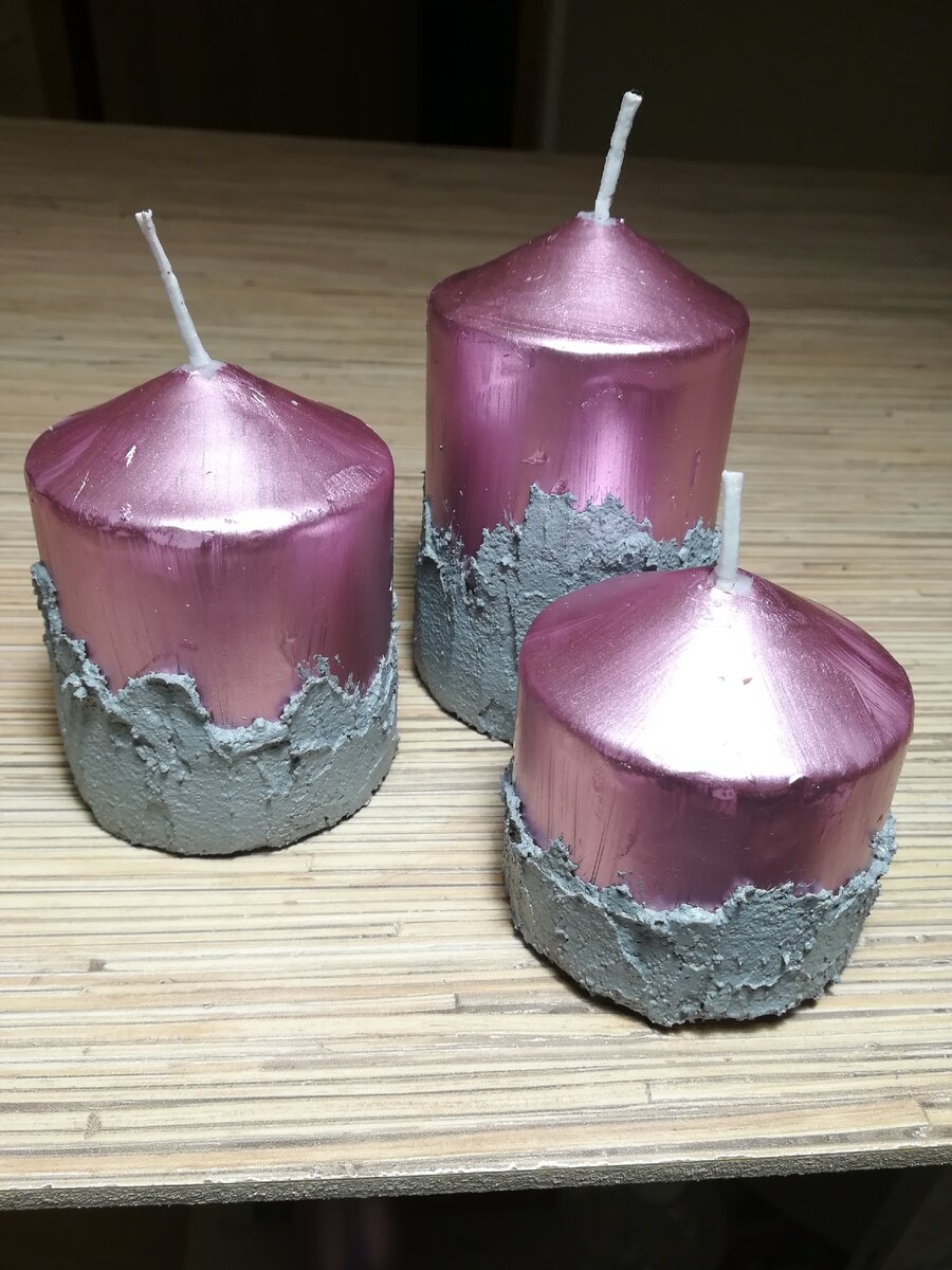 Обычные свечи легким движением рук превращаются... в перламутрово- розовые красотульки в "бетонной" отливке.