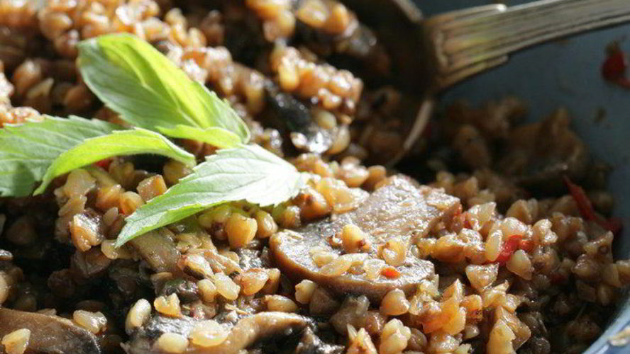 Гречку залить двумя чашками воды, накрыть крышкой и поставить на сильный огонь. Мелко нарезать лук. Когда вода закипит, добавить небольшую щепотку соли. Убавить огонь, накрыть крышкой и варить гречку до готовности. Шампиньоны вымыть, почистить и нарезать пластинками. В разогретую сковородку влить растительное масло, добавить семена кардамона, мелко нарезанные чеснок и перец чили, лук,шампиньоны, сок лимона,2 ст. ложки соевого соуса. Все вместе обжарить на небольшом огне в течение 2-3 минут. Добавить гречку, немного соевого соуса (если потребуется), перемешать и украсить листьями мяты.