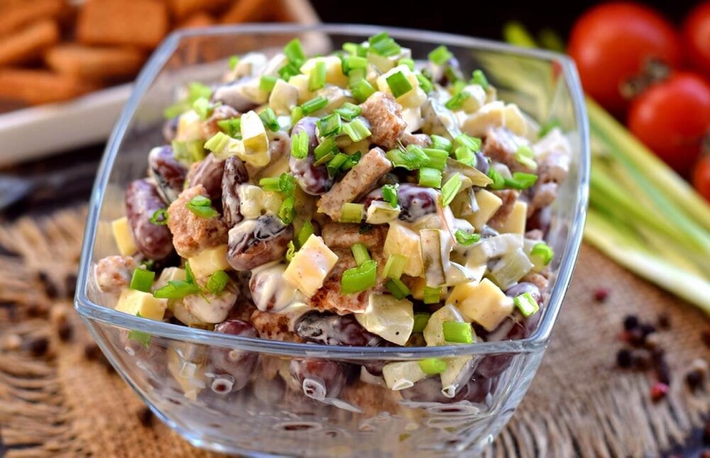 В самом конце добавьте в салат ржаные сухарики. Очень большие экземпляры поломайте на маленькие кубики.