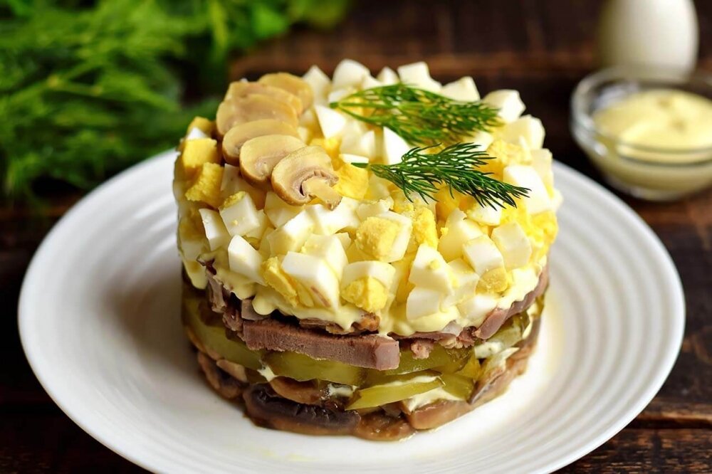 Готовим вкусный и простой салат для праздничного стола. Его состав состоит из 4 основных компонентов, которые великолепно дополняют друг друга. Они выкладываются слоями в четкой последовательности, смазываются майонезом. Перед формированием салата необходимо отдельно отварить свиной язык, обжарить в масле шампиньоны и сварить яйца. Сам салат формируется очень быстро. Порадуйте свою семью новым
